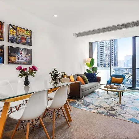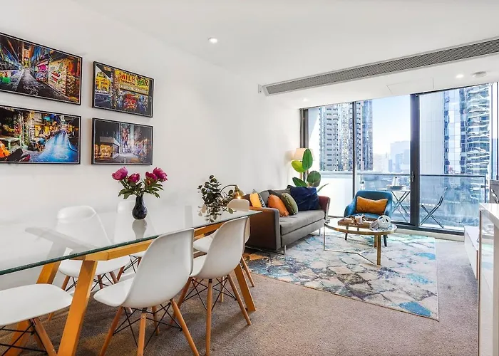 This spacious Southbank 2Br 2Ba Study Gym Pool Parking apartment lies next to the 297.3 m Eureka Skydeck Skyscraper.